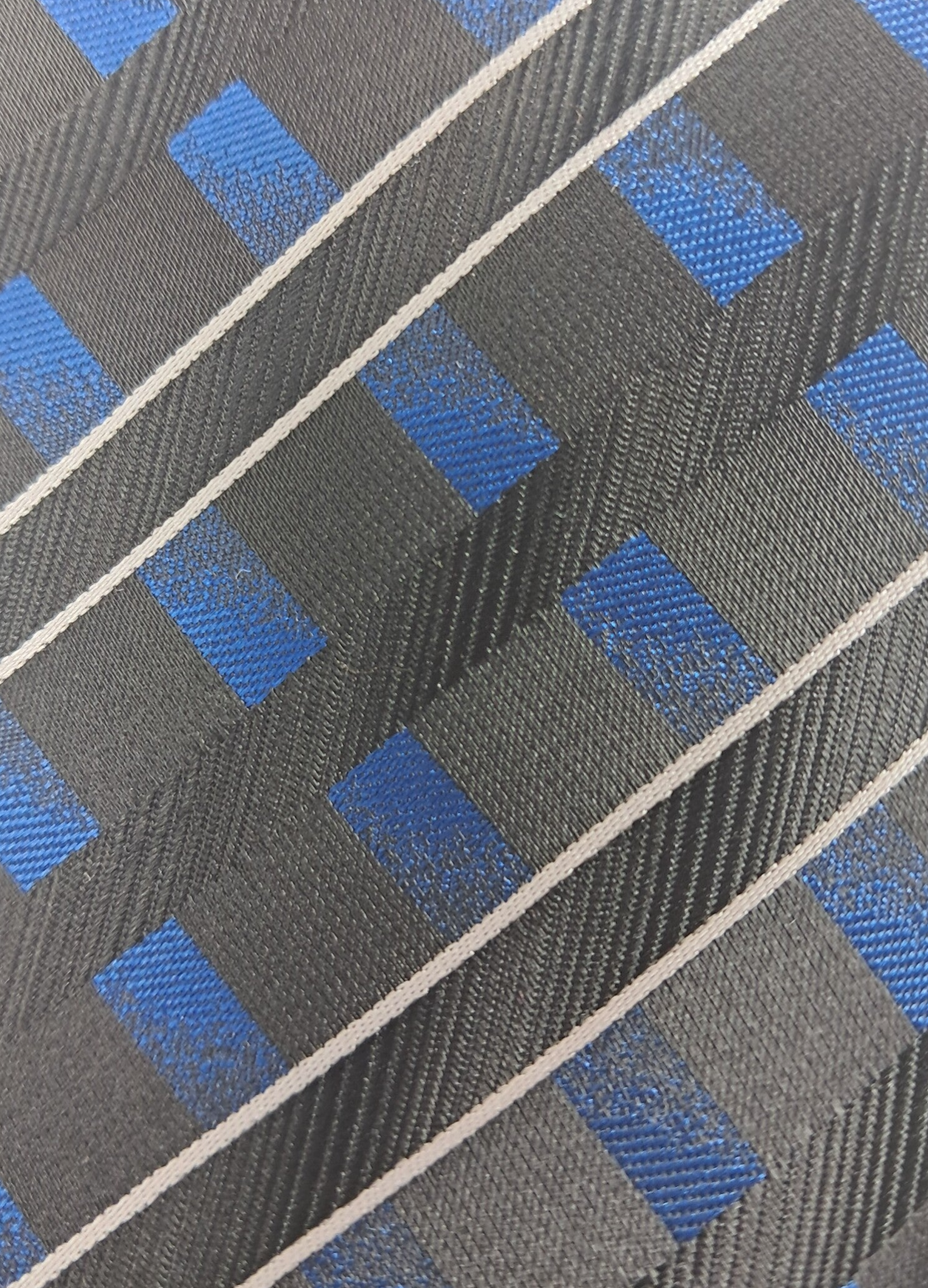 Mooi dessin in zwart, met blauwe blokjes en zwart-grijze strepen. Deze stropdas heeft een lengte van 148 cm en meet op het breedste punt 8 cm. Gemaakt uit microfiber.