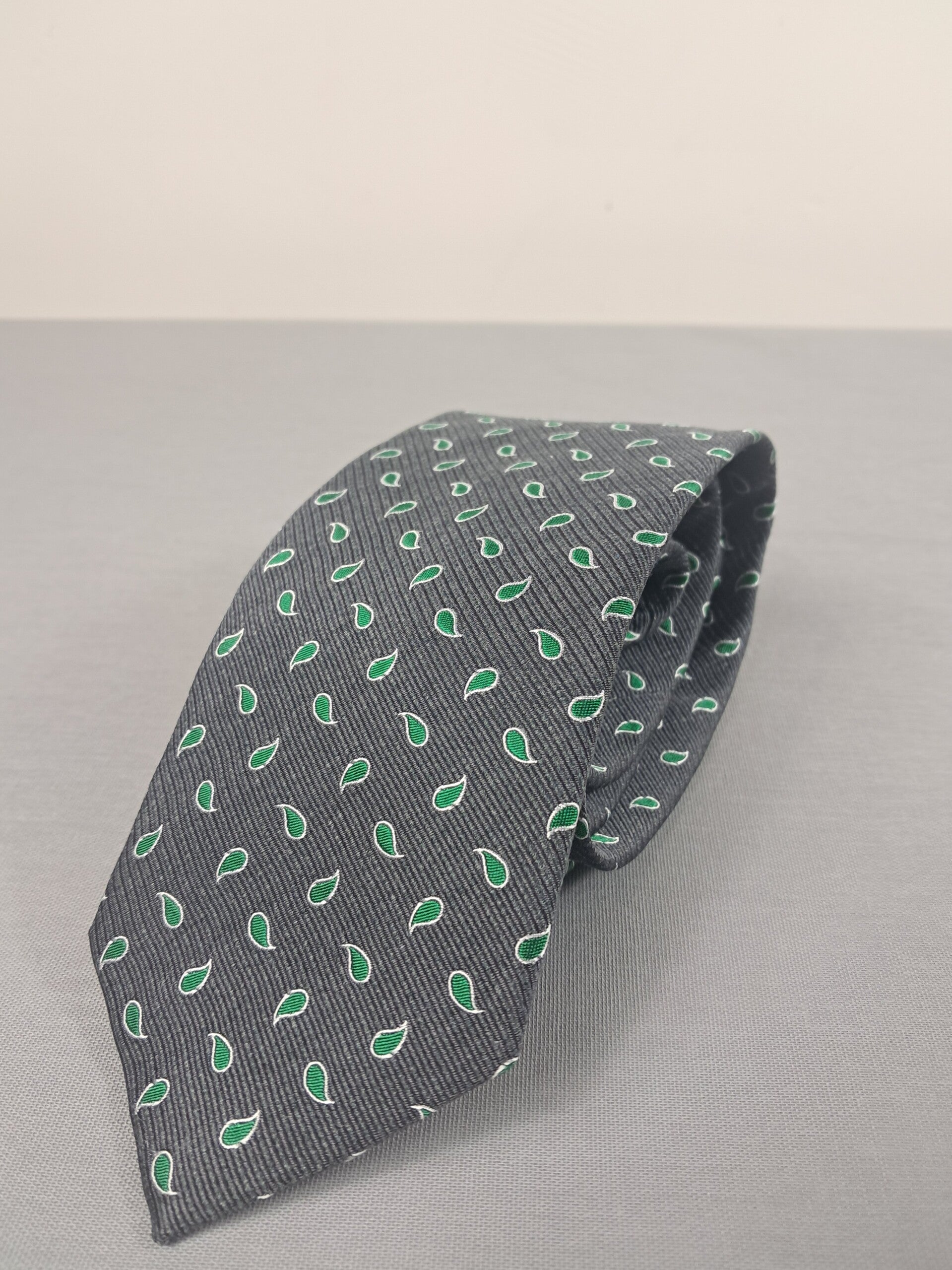 De lengte van deze zijden stropdas is 150 cm en het breedste punt meet 8 cm. Fantastisch materiaal met een klassiek dessin, paisley in grijs en groen. Gemaakt uit zijde.